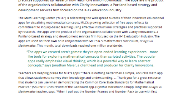 News Latest happenings, announcements, and events Stay on top of the latest news from Clarity Innovations. News & Events Attending DrupalCon in Los Angeles May 8, 2015 News & Events Educational Math Apps Reach One Million Downloads April 28, 2015 News & Events Transforming Leaders at the Idaho Education Technology Association Conference February 4, 2015 News & Events Personalized Learning: A Guide for Engaging Students with Technology February 1, 2015 News & Events National Tech Goes Home Training for Baltimore County Public Schools January 30, 2015 News & Events Seattle Public Schools Technology Summit January 26, 2015 View more